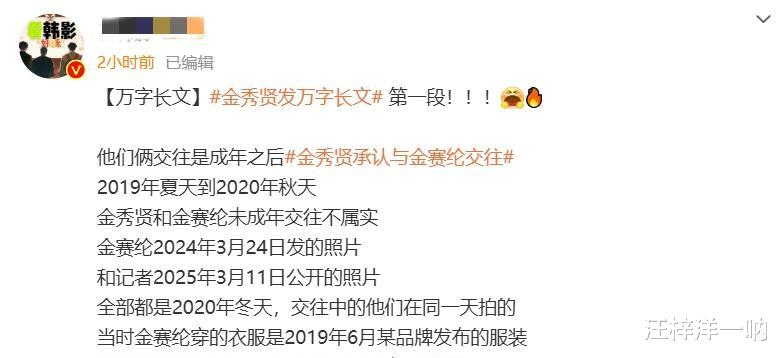 金秀贤的回应虽然姗姗来迟,但内容却引发了更大的争议。无论是恋情时间线的调整,还是对金赛纶的关系定义,都让网友质疑其诚意和真实性。尤其是他试图将恋爱时间推迟到金赛纶成年之后的举动,更是被认为是为了规避道德和法律上的指责。然而,随着网友深挖,所谓“2019年羽绒服上市”的证据很快被推翻,时间线的漏洞也随之暴露。更令人震惊的是,韩媒曝光了两人早期交往的照片,其中金赛纶的年龄明显低于成年标准,这让金秀贤的解释显得苍白无力。