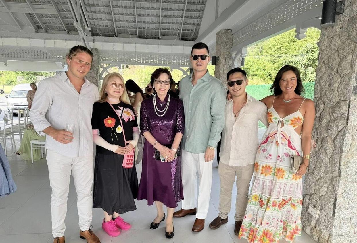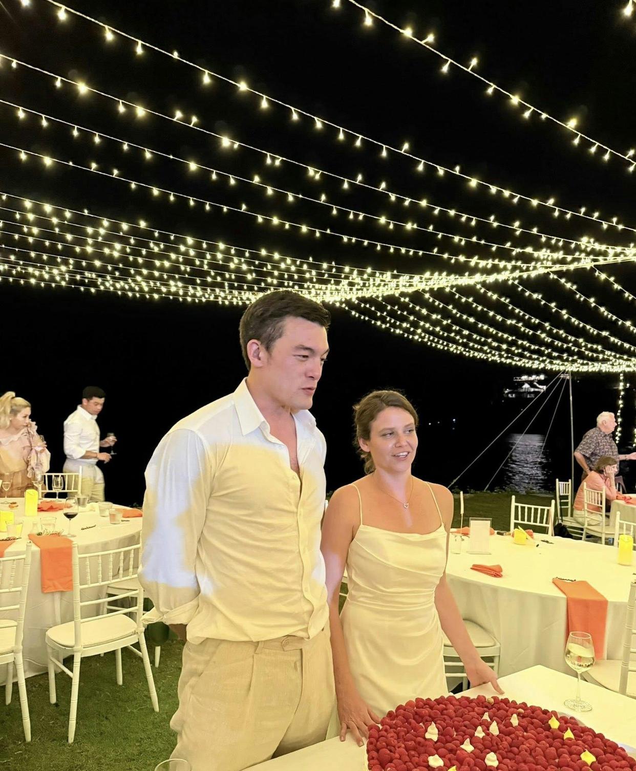 婚礼是在普吉岛的海边办的,特别浪漫。 一条白色的长桥直接通到海中央的仪式台,两边都是蔚蓝的海水。 新郎Roger,也就是杨恭如的弟弟,39岁,身高少说185,壮实魁梧,林建明跟他合照,脑袋才到他肩膀。 这弟弟长得还有点混血味儿,五官挺立体,据说真有四分之一美国血统。 新娘子是个外国人,样貌挺普通,个子也不高,也是刚到Roger肩膀。 俩人打扮得倒简单,Roger一身白色休闲西装,没打领带,新娘就是件白色吊带婚纱,捧着一束黄花。