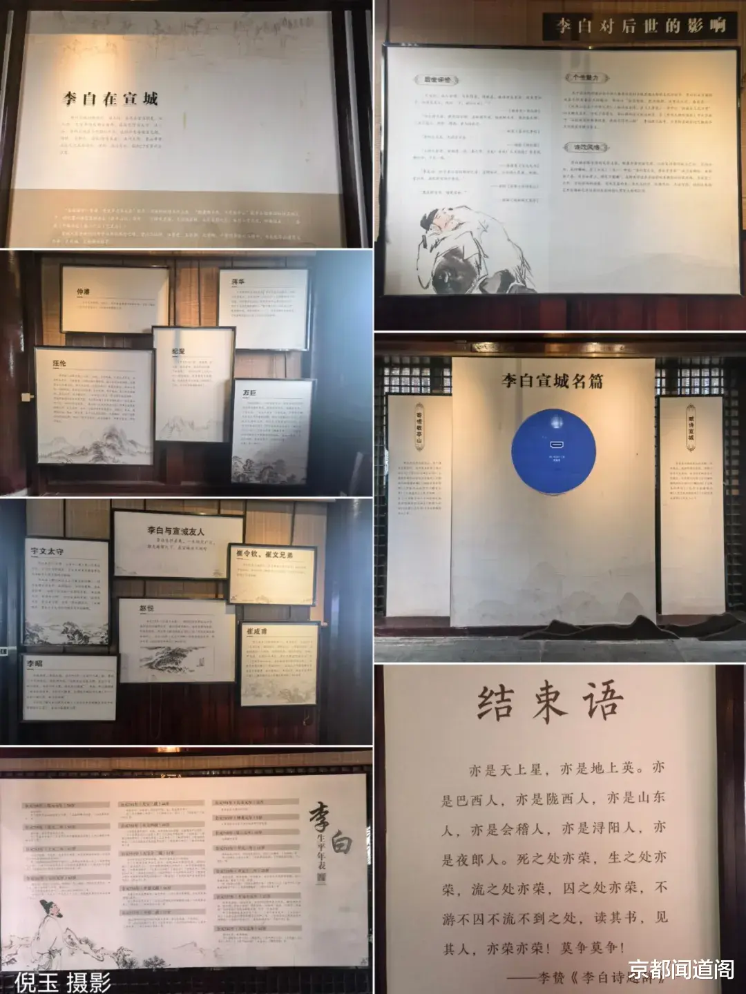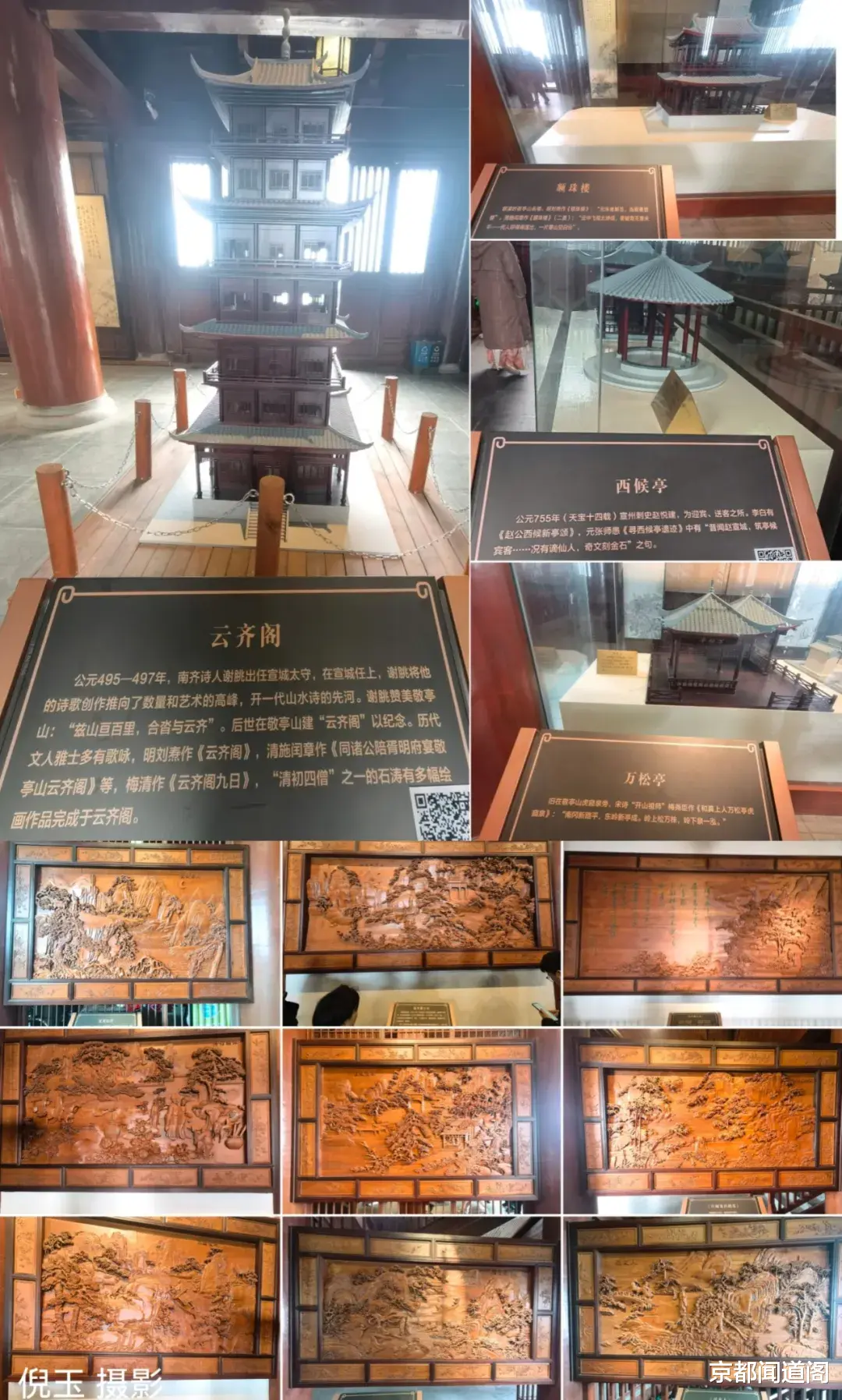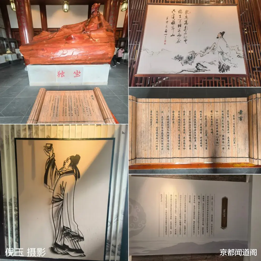 进入太白独坐楼第一层,李白坐像雕塑是本层最大的亮点;拾级而上来到第二层,这里主要展示了李白的人生经历及在宣城的游历足迹;第三层有台阶连接敬亭诗径的标志性建筑;第四层则通过多媒体形式,全方位展现敬亭山的人文与自然之美。太白独坐楼每层都有多处木雕作品,其中《独坐敬亭山图》是太白楼木雕的代表作,工匠们采用镂空雕、深浮雕、浅浮雕等多种雕刻技法,层层雕琢,手法精细,图中的建筑、器物、船只质感细腻,树木、花草、人物栩栩如生,将诗中意境完美呈现在木雕之上。登高望远,不同楼层自有不同感悟。从一层到四层,每一次攀登,视野便愈发开阔,感悟也愈发深刻。