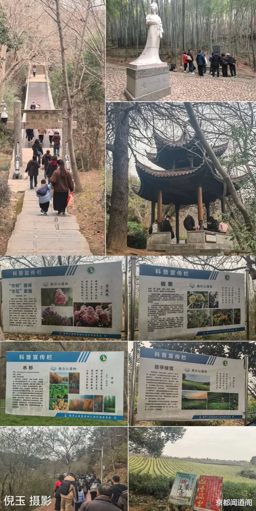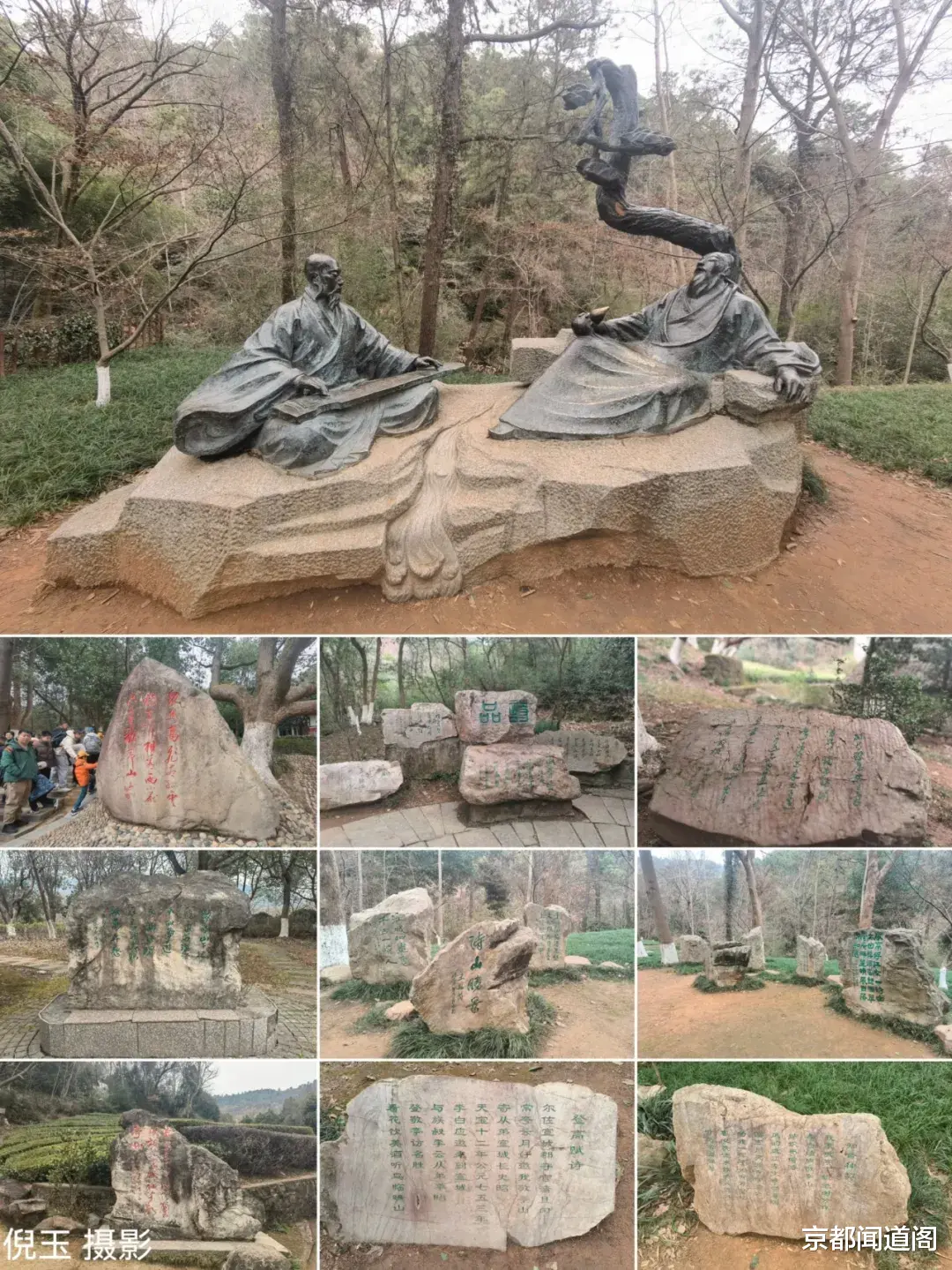 大年初三,告别家乡亲人,我与妻子、儿子一同开启了这场寻诗之旅。驾车抵达位于安徽省宣城市北郊的敬亭山东大门入口处停车场,两座石牌坊率先映入眼帘。前牌坊为3门4柱,楚图南先生题写的“敬亭山”三字苍劲有力;后牌坊为5门6柱,欧阳中石先生的题字雅致端庄。牌坊之上,节选了自南齐至清朝各代名人为敬亭山所作的诗句,无声诉说着这座山浓厚的历史文化底蕴,未登山便已感受到千年文脉的浸润。相关资料介绍,历代文人雅士纷纷追寻谢李的足迹,纷纷上敬亭山挥毫泼墨,唐代的颜真卿、孟浩然、王维、韦应物、刘禹锡、杜牧;宋代的梅尧臣、欧阳修、晏殊、范仲淹、苏东坡、黄庭坚、杨万里、文天祥;明代的李东阳、汤显祖、文徵明、王思任;清代的姚鼐、施润章、石涛等诗人书画家320余人在此留下了近千篇首诗词、山记等,使敬亭山成为“吟无虚日”的江南诗山。