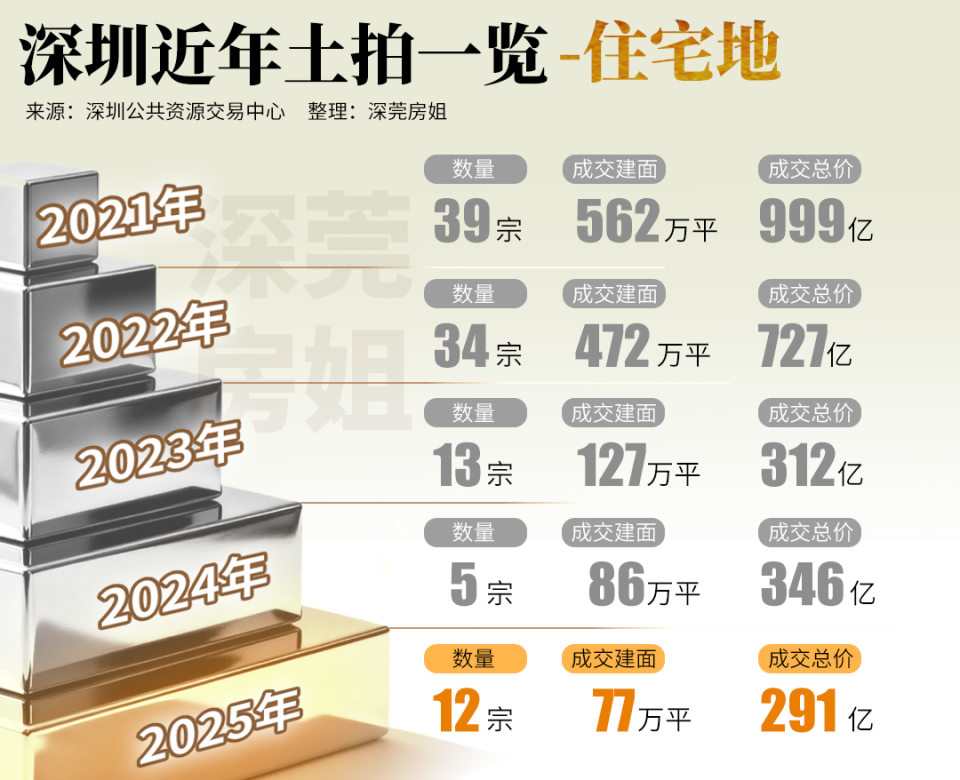 2025年,深圳共成交12宗住宅地,成交总建面约77万平,成交总金额约291亿元。在经历2024年低谷后,2025年深圳住宅供地数量明显增长,大幅增加约140%。