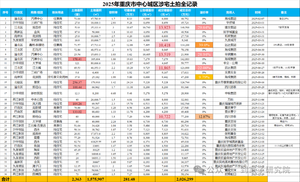 2025年重庆中心城区涉宅用地成交36宗,较去年20宗增长80%;土地面积2363亩,较去年1111亩,增长127%;