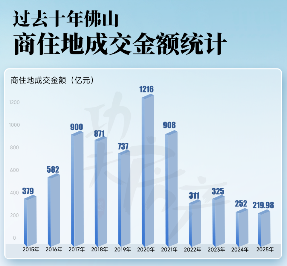 据功夫房产统计,2025年佛山共成功出让了39宗商住地,共揽金约219.98亿,成交面积约149万㎡。结合往年数据看,成交总额为近十年最低,相比2024年商住地成交总额约252亿元,下跌约12%。