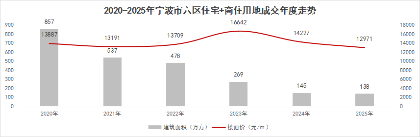 火眼楼市数据显示,2025年宁波市六区土地成交16宗,住宅+商住用地总建筑面积138万方,同比下降5%;土地楼面价12971元/㎡,同比下跌9%。