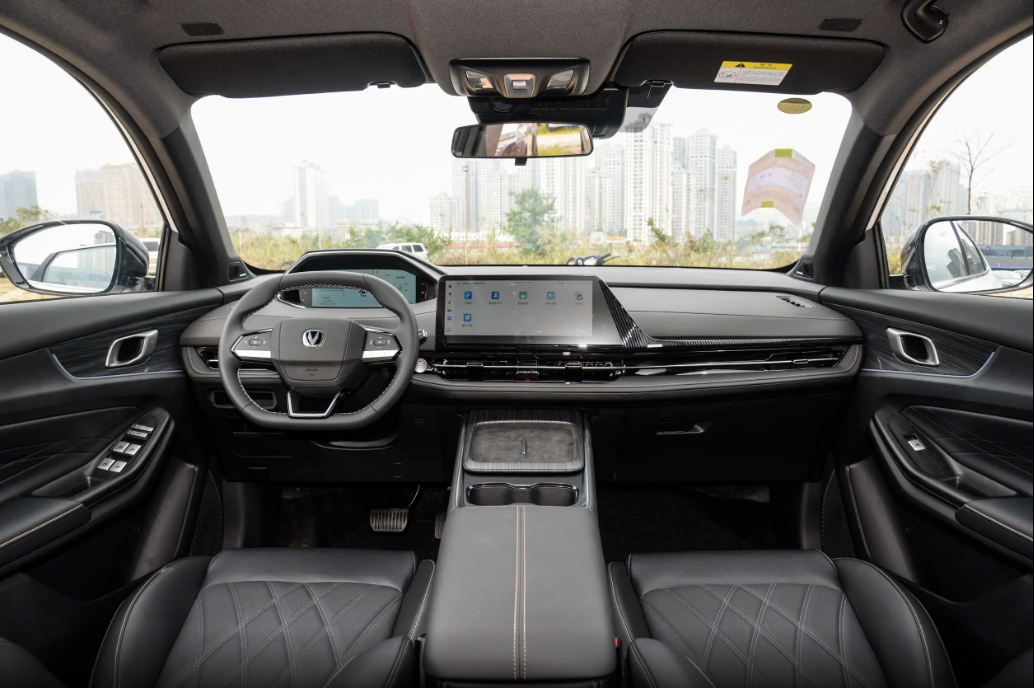 内饰部分,可以看出长安CS55PLUS PHEV的车内采用类似飞机座舱的设计,层次感非常强,内饰的用料也比较出色,软质材料覆盖了整个中控台,仪表的位置比较低,不遮挡视线。采用了一块10.25英寸的全液晶仪表,左右两侧均可自定义功能菜单,包括导航和多媒体系统都可以显示在仪表盘内,中央多媒体屏幕为12.3英寸的高清液晶显示屏,内置在线导航、QQ音乐、喜马拉雅等主流的应用。双平底方向盘的造型让人眼前一亮,也为车内营造出更多的运动气息。