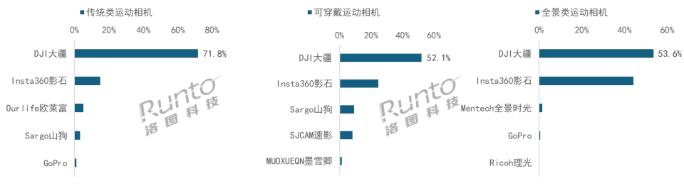 2026年第1-2周,DJI大疆在三类产品中均拿下销量第一,在传统类运动相机市场,销量占比高达71.8%;在可穿戴运动相机市场,销量占比达到52.2%;在全景相机市场,仅凭一款产品osmo 360即夺得53.6%的销量份额。