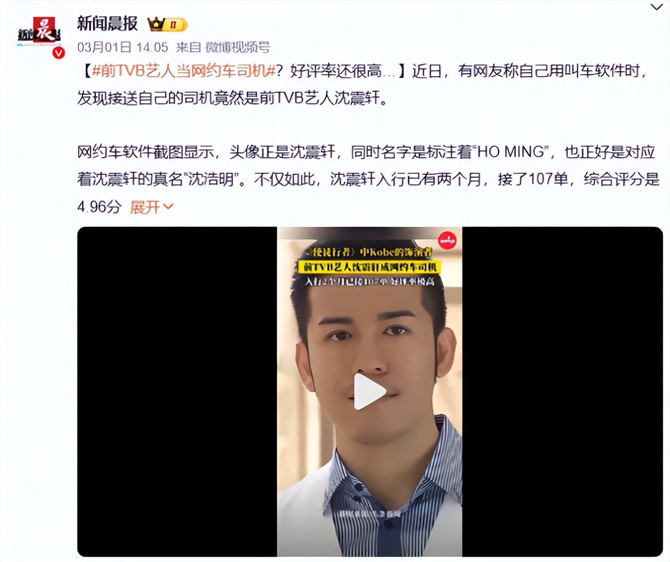 沈震轩,就是那个演过《使徒行者》,让大陆观众记住的TVB演员,最近被发现居然在开网约车。