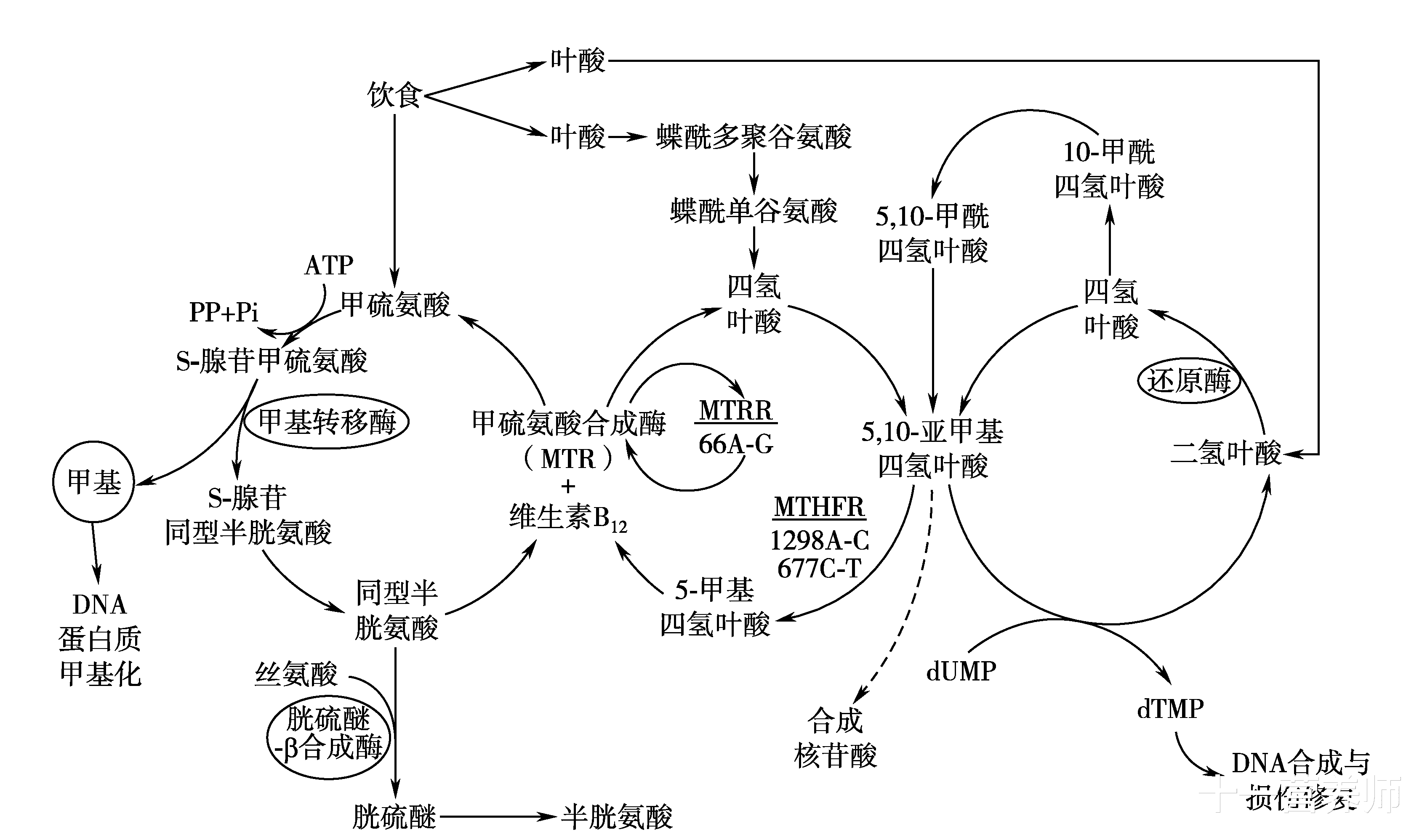 ①叶酸缺乏时,细胞内DNA合成受到抑制,细胞的分裂成熟发生障碍,引起巨幼红细胞性贫血、线粒体功能障碍所导致的多种病症。