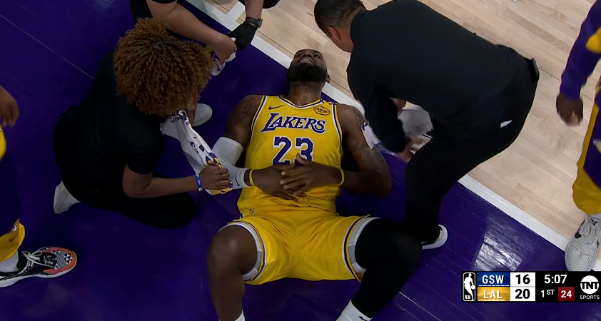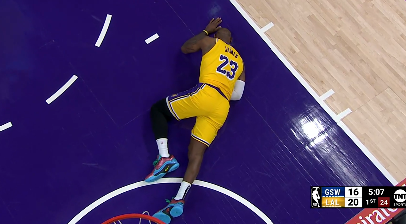 湖人和勇士本赛季第四次交手,第一节湖人22-26落后4分,东契奇登场9分钟,8投2中仅拿到4分3篮板,詹姆斯2投0中一分未得,仅贡献1篮板2助攻,湖人两大领袖在场上的状态都不好;期间詹姆斯空切时自己的腹部撞到库明加,随后老詹捂着腹部倒地不起,痛得拍打地板,所幸身体无碍。