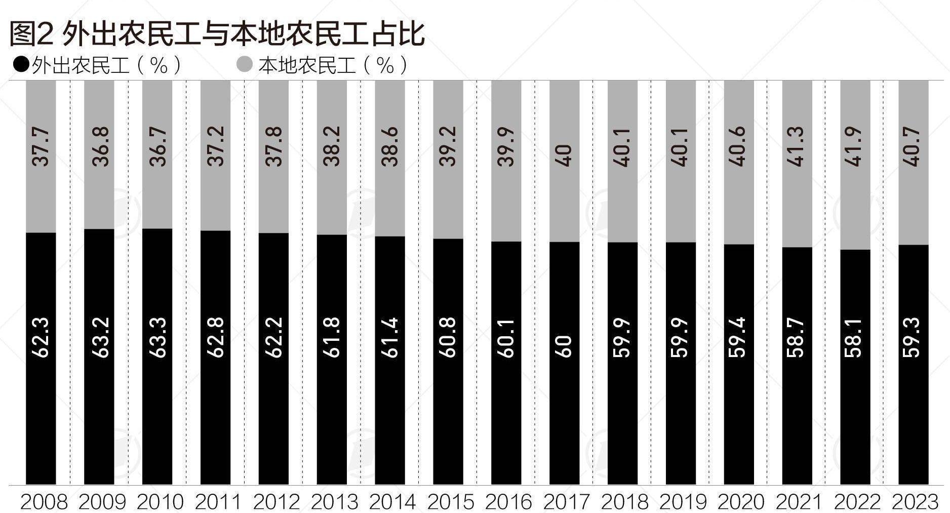 2020年疫情更是当头一棒,出现了罕见的负增长(-1.8%)。虽然后面两年稍微回了点血,涨了2.4%和1.1%,但2023年又跌回0.6%,跟2018年一样,勉强增长个191万人,凑到总量29753万。这微弱的增长,全靠外出农民工(17658万,增长2.7%)撑着,本地农民工(12095万)反而减少了277万,下降2.2%。