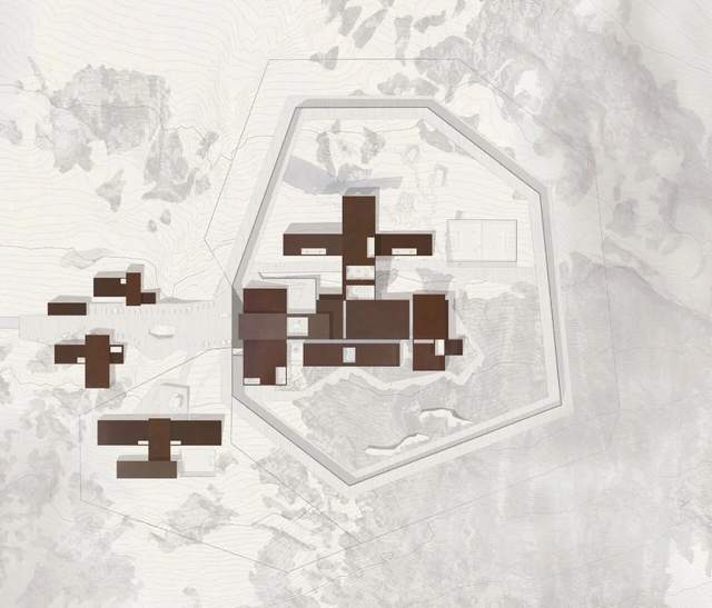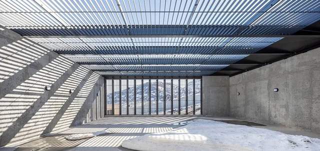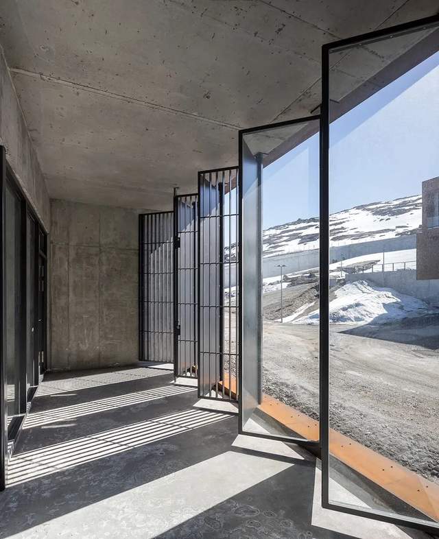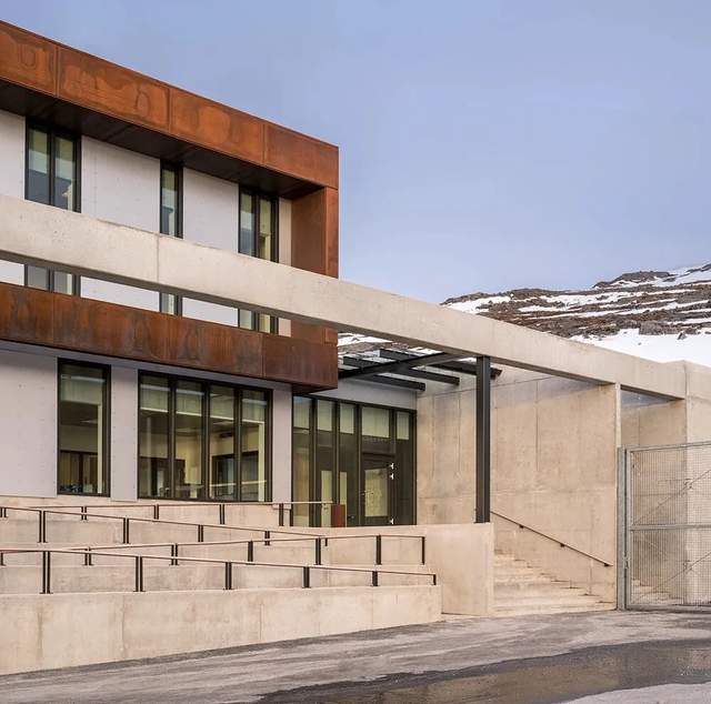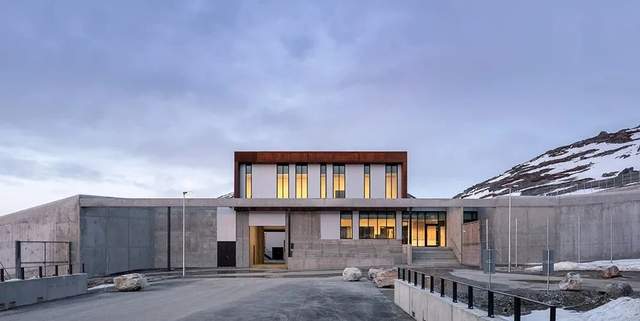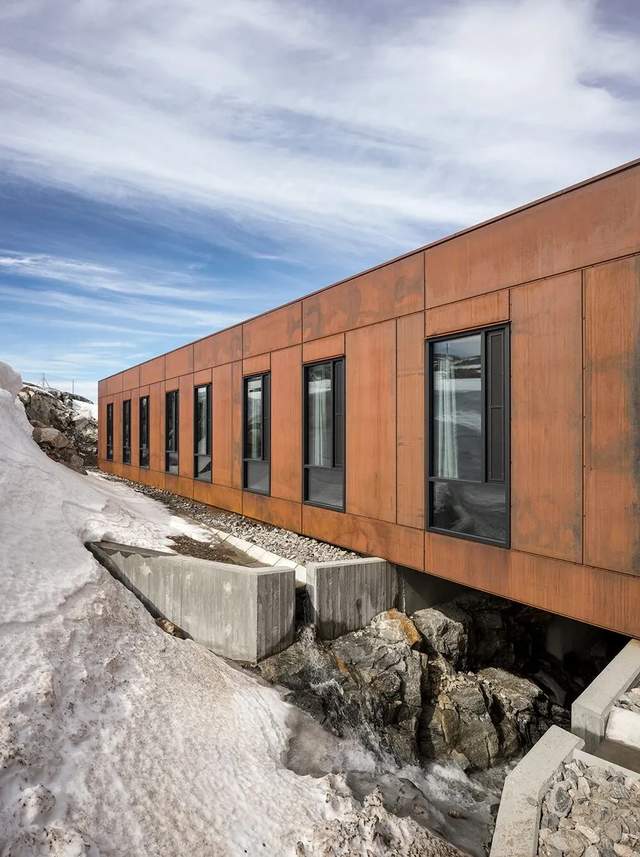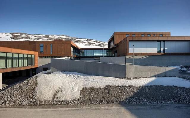 建筑由SHL建筑事务所联合Friis & Moltke事务所设计,远远望去,外立面覆盖着锈红色的耐候钢板,几乎与深色的岩石和起伏的地势长在了一起。