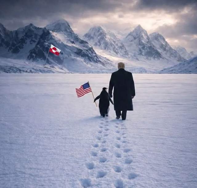 2026年1月23日,白宫发布一张AI合成图:特朗普与持旗企鹅行走在冰天雪地中,前方插着格陵兰岛旗帜。自2025年上任后,特朗普多次扬言要得到丹麦自治领地格陵兰岛,这让格陵兰岛一直成为全球关注的焦点。