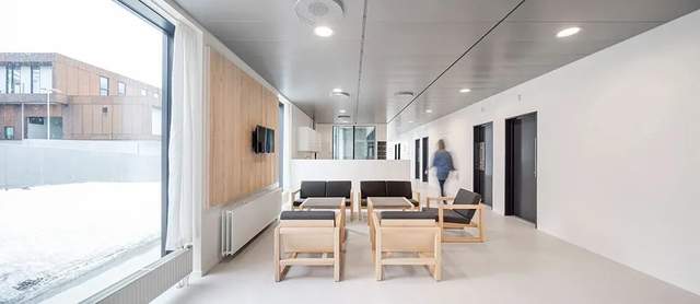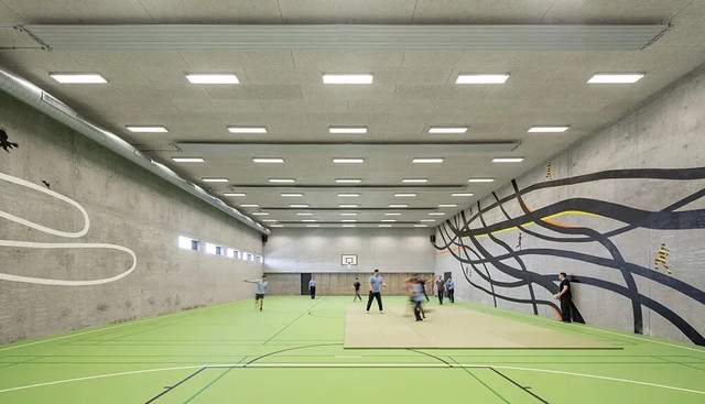 这里具备一切北欧式关怀的设施:工作坊、体育馆、图书馆、祈祷室,甚至医务间。在祈祷室的墙上,雪花般的装饰源自传统服饰的纹样;体育馆中的图案则藏着本地神话的隐喻。