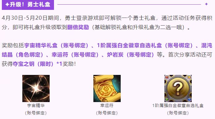 最后是升级!勇士礼盒!活动也是在4.30开始,它是以做任务,升级礼盒的方式获得奖励,奖励包含宇宙精华、1阶属强徽章自选礼盒、混沌结晶、幸运符等道具。