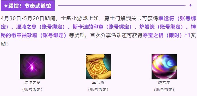 五是踢馆!节奏武道馆!活动在4.30开始,是全新的小游戏,解锁关卡,可获得混沌之息、幸运符、斯卡迪的印章、炉岩炭等道具。