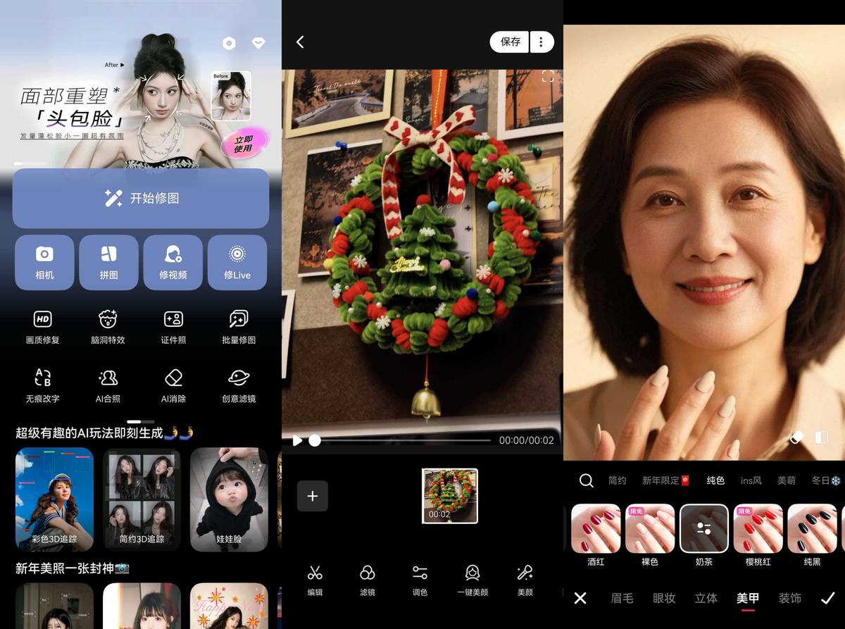 如果你更喜欢拍动感的Live图,那鸿蒙版美图秀秀的新功能可别错过。它的首页现在能直接修Live图,年夜饭的热闹、新春的欢乐瞬间都能修出动态质感,节日氛围一下就有了。而且美化板块还新添了一键去雾功能,不管是阴雨天拍的外景,还是室内光线不足的团圆照,都能一键还原清透画质,质感大片这不就来了~另外,年夜饭上想快速给全家福美个颜,或者给妈妈一键加上个“新年美甲”,用它都很方便。