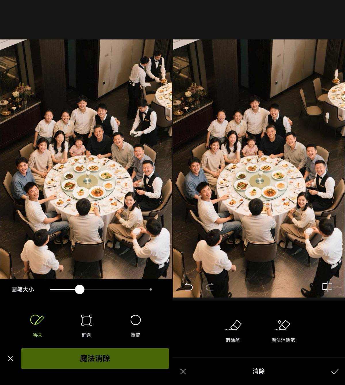 修图可是春节晒照前的必经步骤,鸿蒙版醒图这波更新直接瞄准了春节拍照的两大痛点。一是“人多”,景点里、饭桌边总会有避不开的杂乱背景,现在“魔法消除”功能可以轻松搞定,只需轻轻一点,就能把不相干的路人抹掉,废片秒变干净大片。