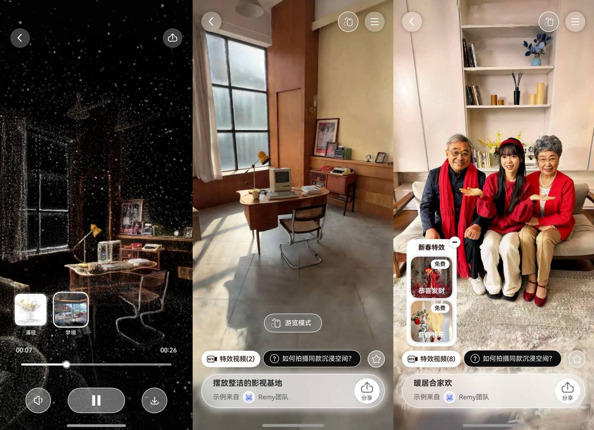 要说今年春节最新奇的,还得是鸿蒙独家应用Remy,它的3D场景记录能力简直“旦用难回”。你可以用它扫描一桌丰盛的年夜饭,连饭菜的热气都能被记录下来;用群像模式拍摄3D版的新年全家福,或者回到长大的老房子,用它的“梦境”特效生成一段充满回忆的3D场景…特别是在最近更新后,人像模式的拍摄清晰度有了大幅提升,推荐大家都去试试!