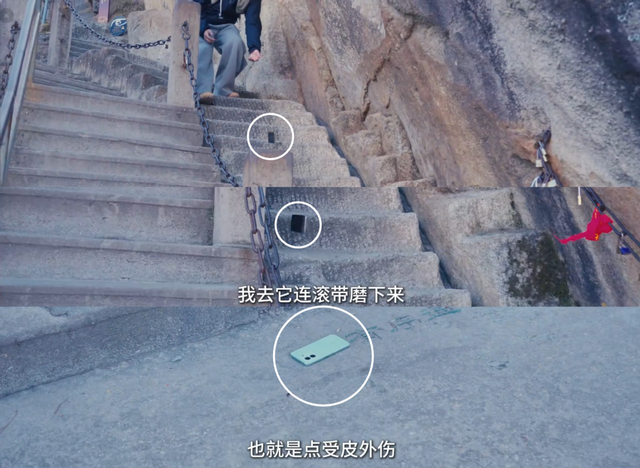 “五岳硬核挑战”的各种测试,简直让人大开眼界,在泰山,它从又陡又长的石阶上“咚咚咚”滚下去;在华山,它被直接往岩石上砸;在衡山更狠,直接被人一脚从台阶高处踢下去,反复碰撞边缘……恒山和嵩山的地形也是各种刁钻,不仅模拟了你日常所有手滑的离谱角度,摔机强度也是远超生活场景。