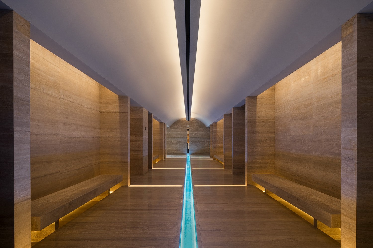 拱是中西古老的建筑元素,通过拱顶的变化划分区域功能,随着脚步的不断深入,空间给人的感觉也将从粗犷变得愈发温馨和放松。中廊水轴自然划分了四个区域,一水之隔划分茶室区、休息大厅、餐厅和温泉洗浴两个区。