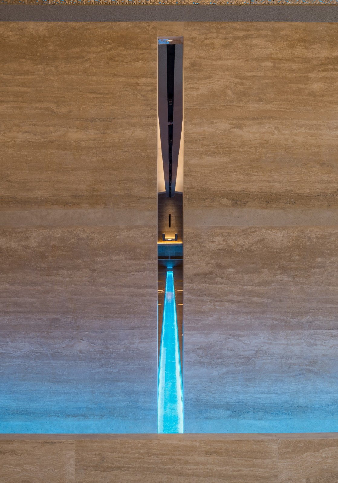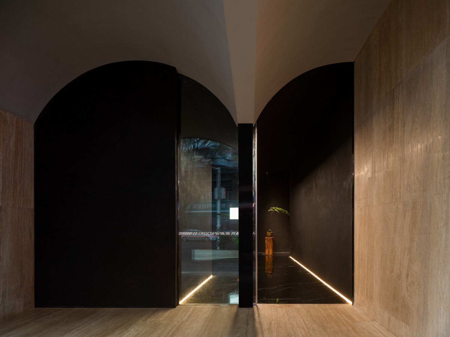 空间中天然石材的质感如一幅宋代山水画,照壁缝隙似山涧中一线飞瀑直泻而下,溅起蓝色波澜,左面黑色竖向机理的半圆形曲面石材墙体如崇山峻岭直指云霄。洞墙外的都市与大厅虽一墙之隔客人似乎已在山水画卷里游荡,沐浴户外柔和的阳光。