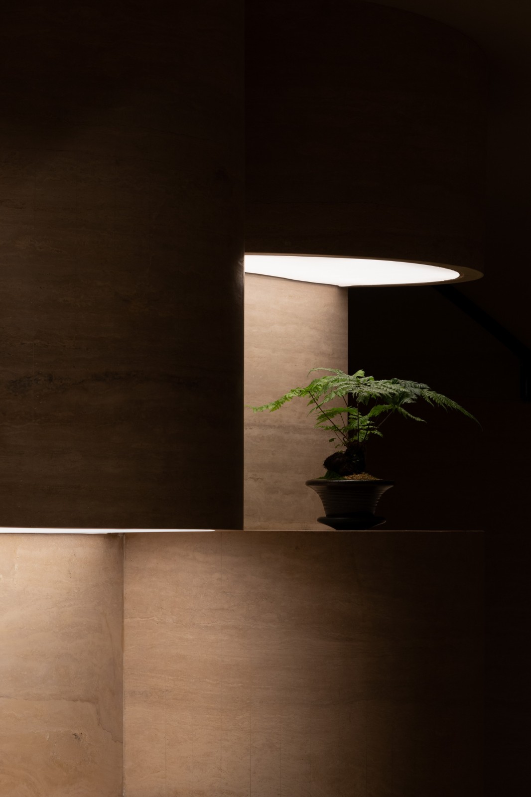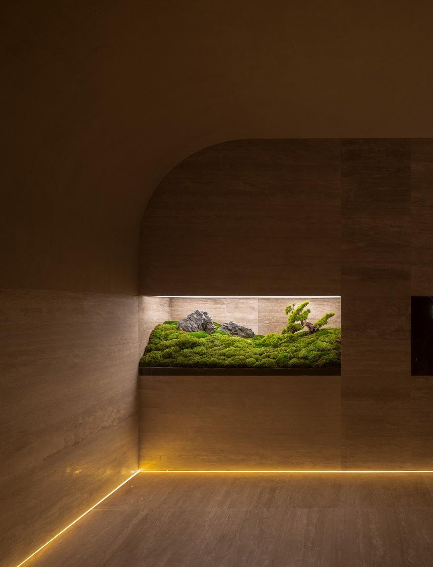 亿伽设计为您分享足浴SPA馆设计,赋有质感的洞石门面将熙熙攘攘杂乱的城市界面打断,一个假山盆景壁龛的序厅唤起崭新的记忆篇章。接待大厅连续波纹金属拱顶的弧面光廊,似时光隧道连接未来与过去。映入眼帘的绿植光影,引导客人寻一处安静的等候区。