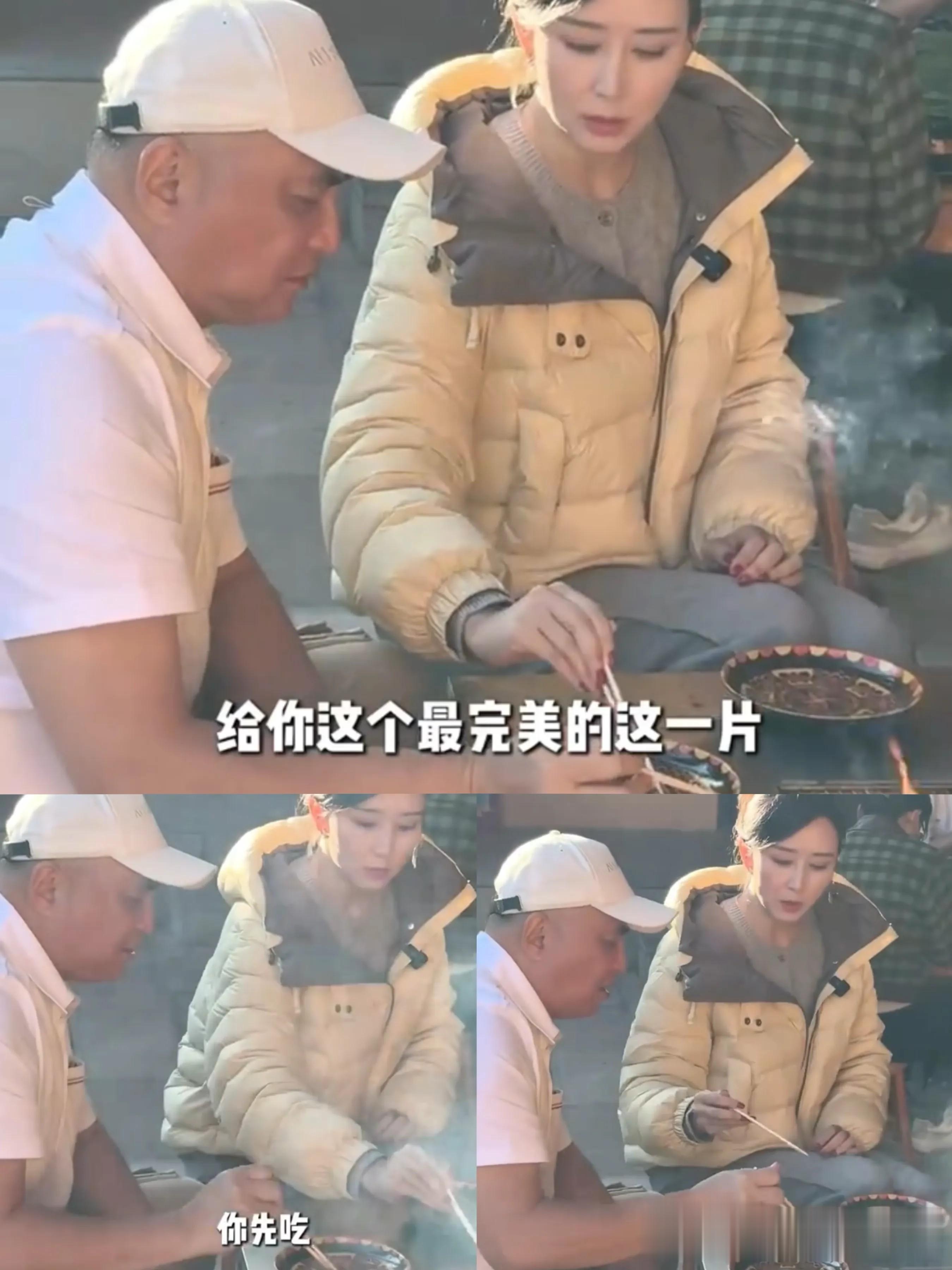 胡静把烤完的肉,先夹给了朱兆祥,而朱兆祥则连忙夹回去让胡静先吃,两个人一来一回的,特别逗。