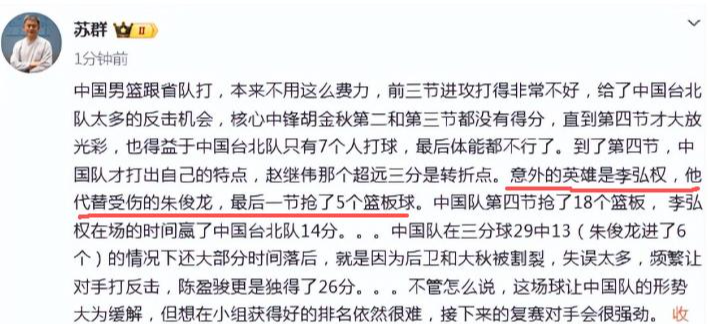赛后苏群夸他是意外的英雄。他发文写道,“中国男篮跟省队打,本来不用这么费力,前三节进攻打得非常不好,给了中国台北队太多的反击机会,核心中锋胡金秋第二和第三节都没有得分,直到第四节才大放光彩,也得益于中国台北队只有7个人打球,最后体能都不行了。到了第四节,中国队才打出自己的特点,赵继伟那个超远三分是转折点。意外的英雄是李弘权,他代替受伤的朱俊龙,最后一节抢了5个篮板球。”李弘权是中国队今天最大的惊喜和英雄。你们说呢?