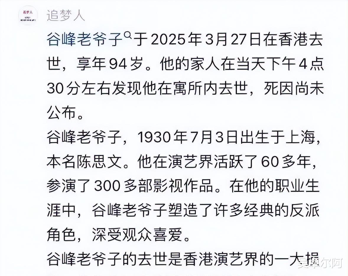 谷峰的离世,让人们感到惋惜和痛心。他的离去,标志着一个时代的结束。但他留下的作品和精神,将永远激励着后辈演员。他的故事,将成为香港电影史上的传奇。