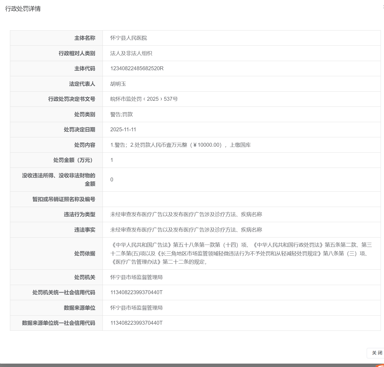 近日,信用安庆披露行政处罚信息,因未经审查发布医疗广告以及发布医疗广告涉及诊疗方法、疾病名称,安徽怀宁县人民医院被警告罚款1万元,行政处罚决定书文号为皖怀市监处罚﹝2025﹞537号。