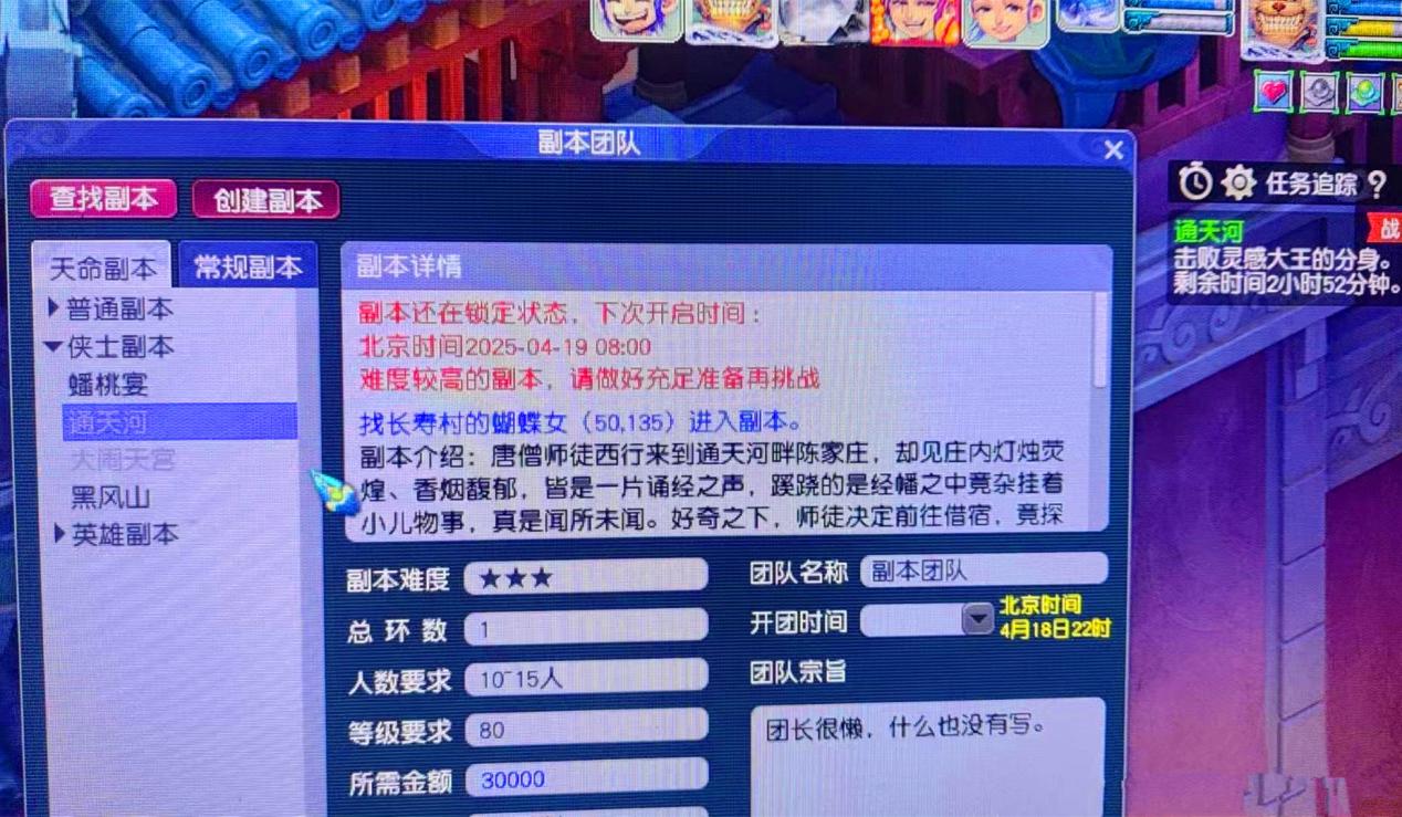 在最近的梦幻西游中出现了一个bug,那就是有一部分玩家会莫名其妙的出现通天河副本任务的任务提醒。上面这位玩家现在就被系统提醒要去杀灵感大王的分身,但是上面这位玩家的通天河副本任务早就已经刷完了,在副本任务的进度还没有被刷新的时候。怎么去完成一次新的通天河副本任务呢?