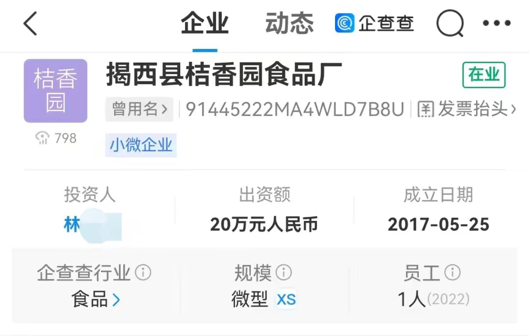 根据公开资料显示,揭西县桔香园食品厂成立于2017年,位于广东省揭西县凤江镇东光村委会后厝村,注册资本20万元,林为投资者。