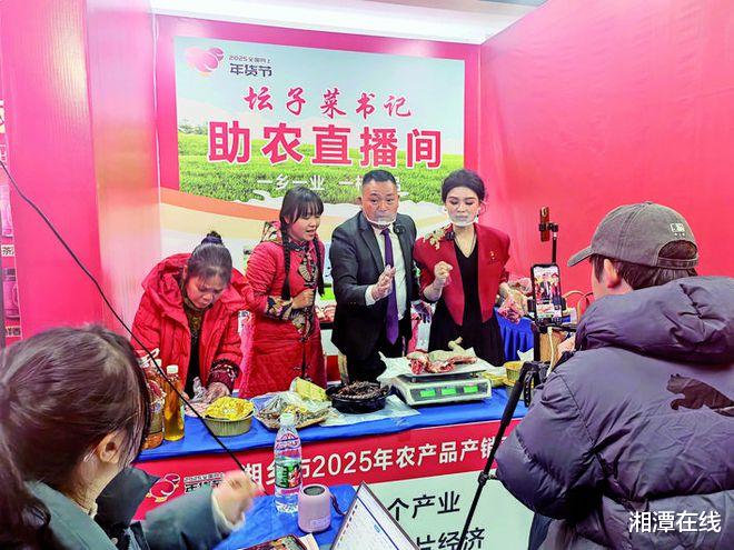 4名“湘乡好物推介官”到每个展位前,跟湘乡农产品企业负责人探讨交流、传经送宝。他们还走进设在现场的直播间,和当地带货主播一起推销湘乡优质农产品。
