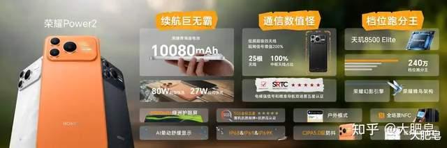 荣耀Power2打造了强大的机身可靠性,机身中框采用四角榫卯卸力设计,抗摔能力提升25%,抗弯能力提升22%,整机通过SGS金标五星整机抗跌耐摔+抗挤压认证。同时,其还具备IP68+IP69+IP69K满级防尘防水,支持超高温、超时长、任意种类防水以及10000+次反复入水无忧四重防护,即使在极端户外环境也能轻松应对。