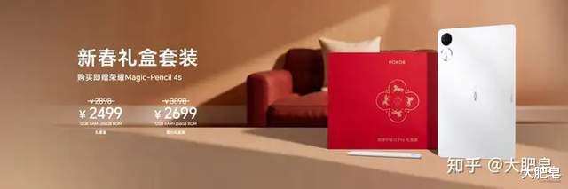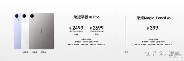 荣耀平板10 Pro于1月9日10:08全渠道正式开售,12GB+256GB标准版售价2499元、12GB+256GB柔光版售价2699元,全新手写笔荣耀Magic-Pencil 4s售价399元;此次将所有配置都升级为新春礼盒套装,12GB+256GB礼盒版现价2499元,12GB+256GB柔光礼盒版现价2699元,购买即赠荣耀Magic-Pencil 4s手写笔;荣耀平板X10 Pro于1月9日10:08全渠道正式开售,8GB+128GB版本售价1499元、8GB+256GB版本售价1699元、8GB+256GB柔光版售价1899元。