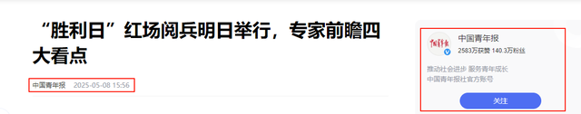 1.原文登载于中国青年报2025年05月08日关于“‘胜利日’红场阅兵明日举行,专家前瞻四大看点”的报道