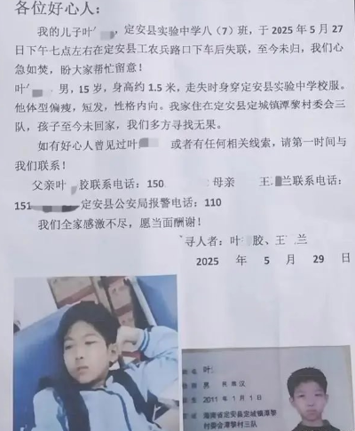 小叶父亲叶先生向记者透露,孩子近期在家和学校均未表现出异常,与家人、同学均无矛盾。事发前小叶曾短暂回家称肚子疼,但面对母亲询问时又沉默不语。这一细节引发外界诸多猜测。目前家属已发动亲友在周边区域展开地毯式搜寻,并在各处张贴寻人启事。