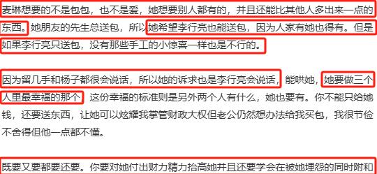 故此麦琳一系列心口不一的表现,网友认为她就是既要又要还要。闺蜜收到的包包她要,但还不能只有包包,留几手杨子的优点李行亮要有,但又要高于他俩,总而言之就是一句话:尽最大努力满足我,不论我的要求多么不可理喻。