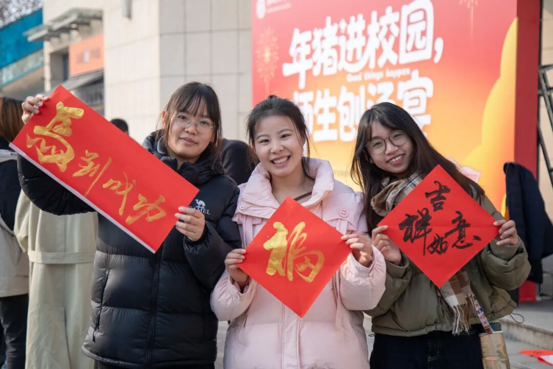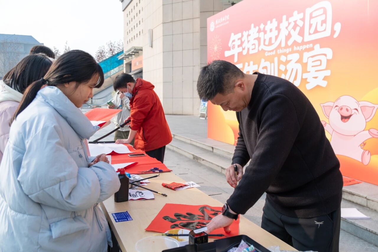随后,师生们移步至精心布置的食堂。在等待美味烹制的温馨间隙,一场笔尖上的年俗悄然展开。一侧长桌上,早已备好笔墨红纸。师生们兴致盎然,纷纷提笔,或凝神书写春联,或趣味描画“福”字。有书法功底的学生挥洒自如,初次尝试者亦乐在其中。墨香萦绕,笑语连连,这段充满文化意趣的等待时光,不仅凝聚了期盼,更让传统节庆文化在互动中自然流淌。