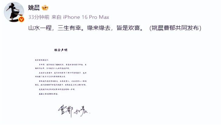 3 月 16 日,姚晨和曹郁公布离婚消息。