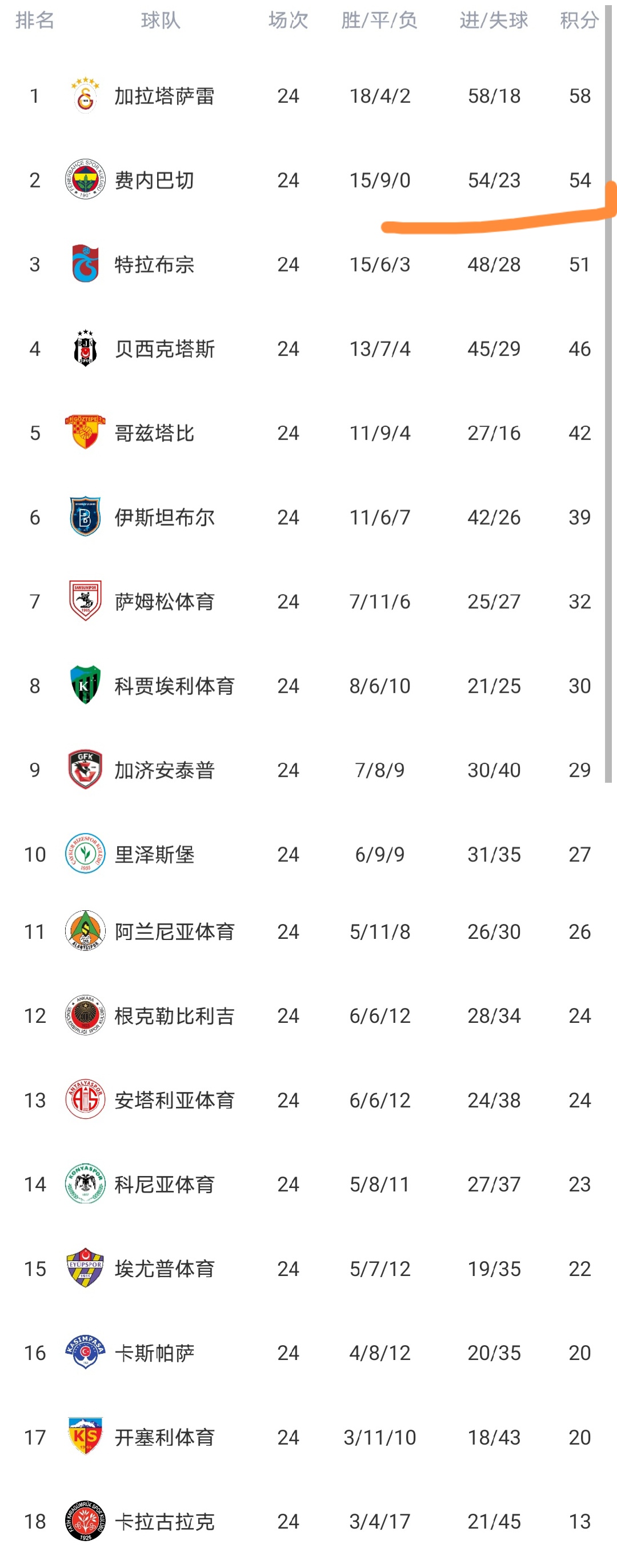 昨晚至今天凌晨,土超第24轮结束了3场较量,费内巴切、安塔利亚体育等队出战,这三场较量之后,土超所有球队都已经踢完了第24轮的比赛,土超积分榜发生变化。