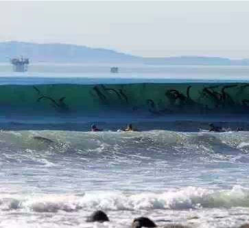 这张照片看上去好像是在海面下面有一群章鱼,但是并不是章鱼怪的打击,而是大浪中搀杂了很多海藻罢了。