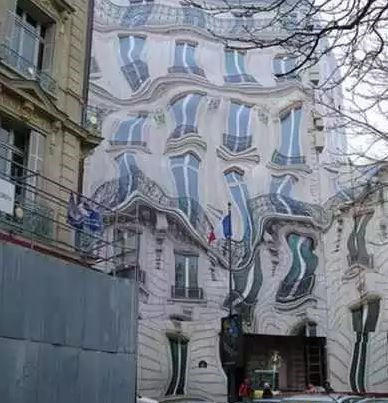 这不是修建被滤镜给歪曲,而是正在扶植的屋子外面铺设的抽象派遮挡物。