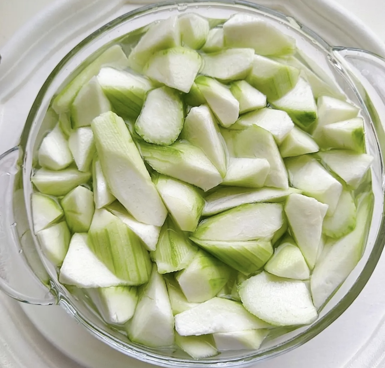 2:丝瓜清洗干净后,我们用削皮刀轻轻刮去外皮(也可以不削皮,视个人喜好而定)后切成滚刀块或斜片状,方便后期烹饪。值得一提的是:丝瓜切好后,记得放入清水中浸泡,以防氧化变黑,影响色泽。