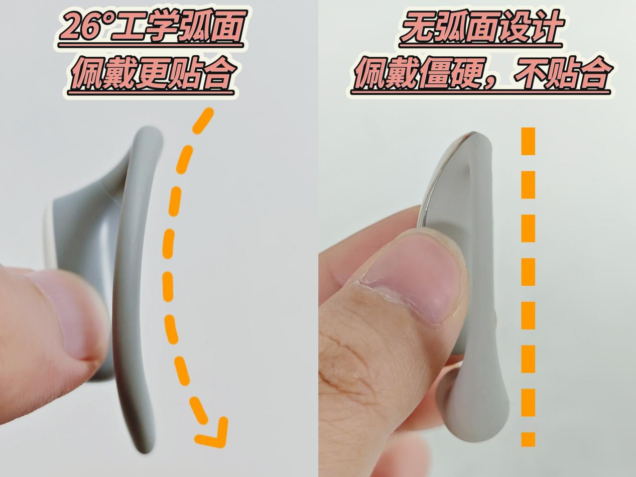 当佩戴上这款开放式耳机时,会觉得非常的稳固,与耳廓的贴合度很高,这是因为这款耳机的弯折处有个特别的弧度——这是虹觅特有的26°工学曲面设计,一只耳机的重量是6.8克重,外层包裹着亲肤硅胶,日常通勤十分舒适。