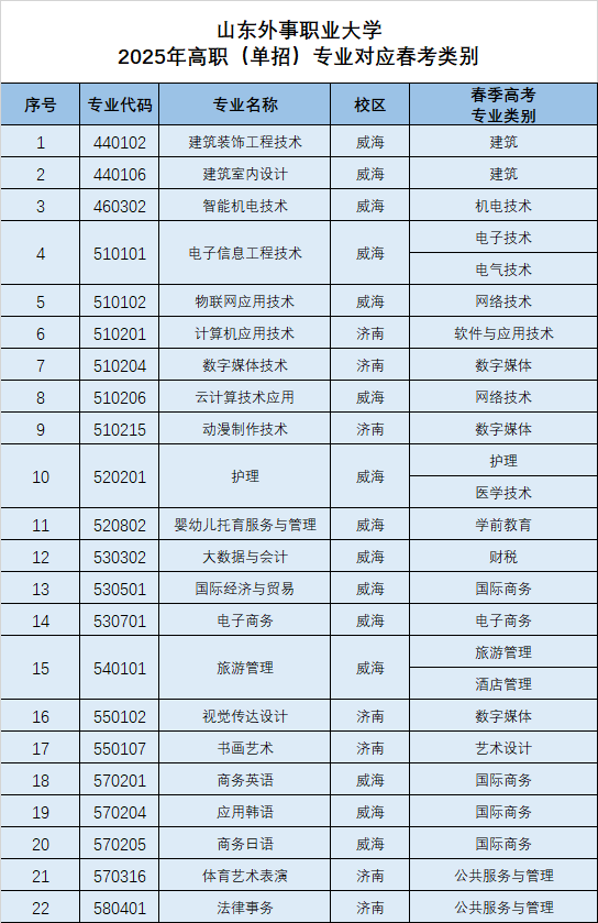 山东外事职业大学2025年高职(单招)专业对应春季高考类别