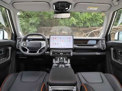 座舱的设计感挺不错的,硬朗的线条肆无忌惮的诠释着硬派越野车的风格,然而,车内的做工用料比较高端,大量皮革包裹搭配线缝条点缀,档次感还是挺不错的。而且,新车还配备了15.6英寸悬浮式多媒体屏幕、10.25英寸液晶仪表盘,还有高通骁龙8155芯片,此外还有6颗超声波雷达、3颗毫米波雷达,硬件水平也很高。