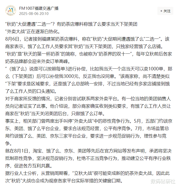 深夜的福州仓山,“茶小甜”奶茶店的灯光依然亮着,电脑屏幕里的美团后台页面显示着实时订单数据,桌前的手指悬在“店铺关闭”按钮上,指尖泛白。这并非孤例。8月6日,福州、厦门、泉州等多地奶茶店均收到饿了么业务员的口头通知:要求“秋奶”(8月7日立秋)当天下架美团平台,独家经营饿了么店铺。有商家晒出与业务员的聊天记录,内容提及“这是区域任务,必须完成”“否则后续补贴将受影响”,甚至提出“每单补3元”的补偿条件——若当天店铺订单量达1000单,可获3000元补贴。补贴背后的“赔本账”行业人士算了一笔客观账:以某奶茶店为例,若平时美团订单占比40%(约500单/天),每单利润约4元,下架美团将直接损失2000元利润;即使获得3000元补贴,看似覆盖了损失,但老客户因找不到店铺而流失的长期影响,远非短期补贴能弥补。“二选一”更像一场“赌局”,商家赌的是短期补贴能否覆盖长期客户流失的成本,而小商家往往“赌不起”。声明与行动的矛盾值得注意的是,8月1日,饿了么与美团、京东等平台共同发布《关于规范促销行为的声明》,明确承诺“坚决抵制恶性竞争”“尊重商家自主选择权”。但仅5天后,“二选一”的要求便接踵而至,让这份声明的可信度备受质疑。用户的“用脚投票”“秋奶”本是消费者对“温暖消费”的期待,却因平台竞争沦为“套路战场”。有用户表示:“平时习惯用美团订奶茶,要是当天找不到常去的店,可能就换别家了。”这种因平台强制要求导致的用户流失,最终还是由商家承担后果。结语:“秋奶”不该是“流量战场”截至8月6日晚,不少商家选择坚持不下架美团——他们不愿因短期补贴放弃长期积累的客户,更不愿被平台“绑着走”。“秋奶”的意义,本是一杯温暖的仪式感。当平台将其异化为“流量争夺赛”,受伤的不仅是商家,更是消费者对“温暖消费”的期待。期待监管的“紧箍咒”能真正落地,让“秋奶”回归本质,让商家有选择的自由,让消费有温暖的温度。