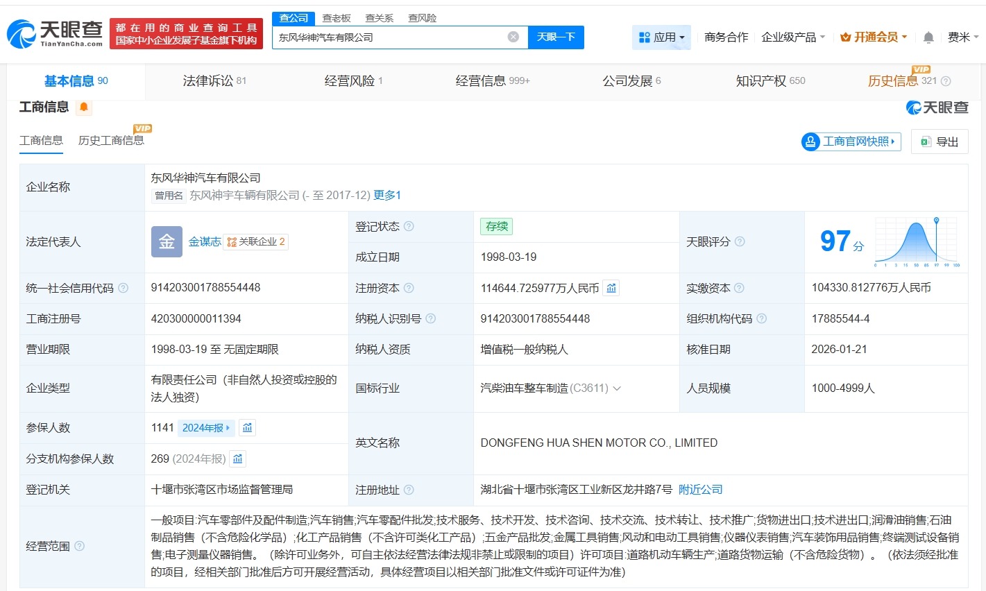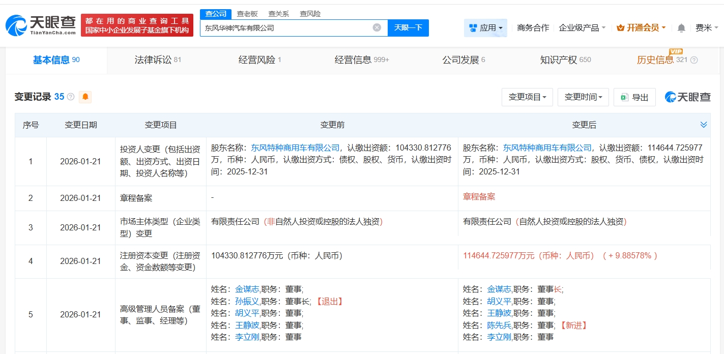 天眼查App显示,近日,东风华神汽车有限公司发生工商变更,注册资本由约10.4亿人民币增至约11.5亿人民币,增幅约10%,同时,孙振义卸任董事长,由金谋志接任。