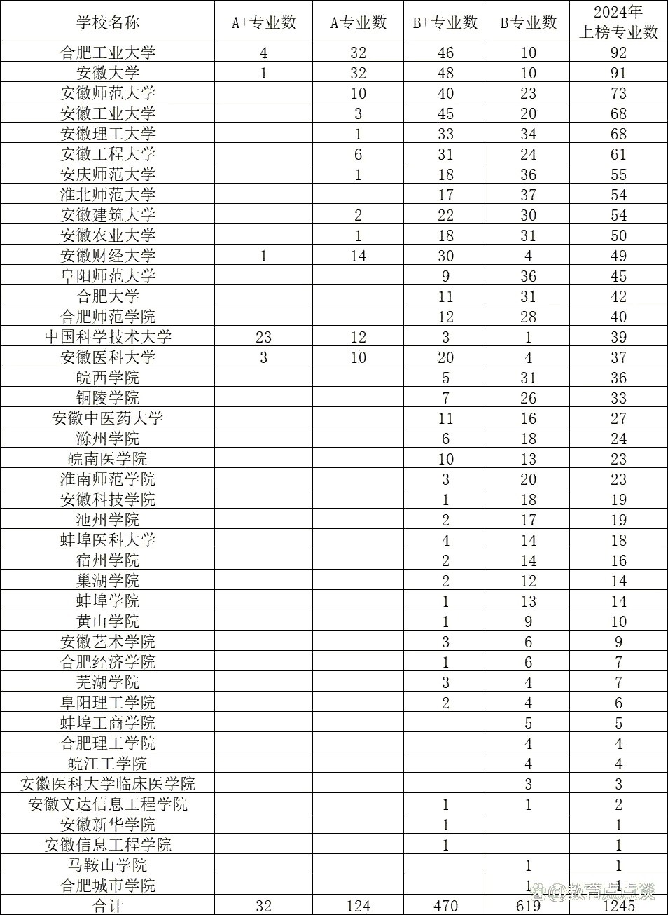 学校名称全国排名核心标签特色亮点中国科学技术大学9C9/双一流A类量子信息科学全球领先,少年班英才辈出合肥工业大学55211/双一流“汽车界黄埔军校”,新能源汽车研发全国领先安徽大学86211徽学研究中心独树一帜,法学专业通过国家级认证安徽师范大学120省重点教育学专业全国前20%,师范生培养质量享誉华东安徽农业大学146省重点茶学专业全国唯一博士点,助力乡村振兴安徽医科大学150省重点皮肤病学国家重点专科,临床技能竞赛屡获佳绩安徽工业大学205省重点冶金工程全国前15%,服务长三角制造业升级安徽财经大学215省重点会计学全国B+评级,ACCA通过率超全球均值合肥大学216新兴高校生物工程全国第一,产学研合作企业超200家安徽理工大学266省重点矿业工程全国前10%,深地科学领域贡献突出双一流高校“王炸”专业榜